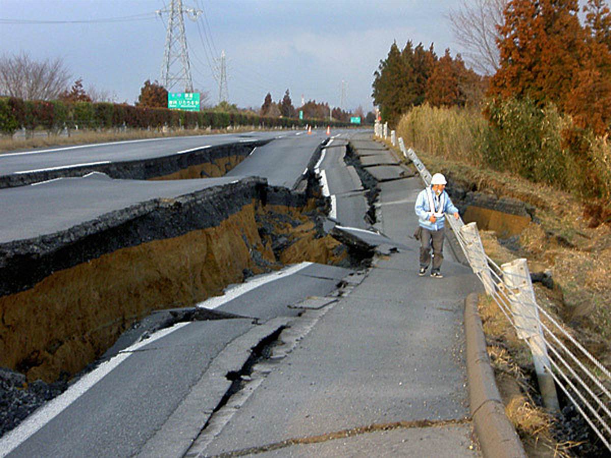 Un trabajador inspecciona una sección destruida de la autopista Joban, cerca de Mito, prefectura de Ibaraki.
