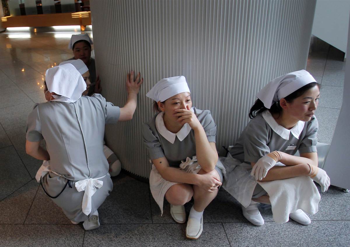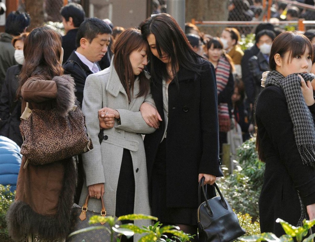 Mujeres esperando tras haber evacuado un edificio de Tokio cuando sucedió el terremoto.