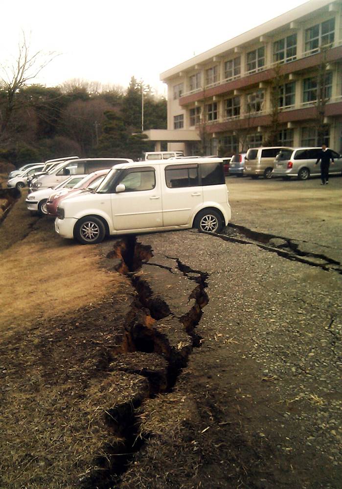 Vehículos sepultados por tierra y un muro que se rompió en un parking de la ciudad de Mito, en la prefectura de Ibaraki, tras el terremoto del pasado 11 de marzo.