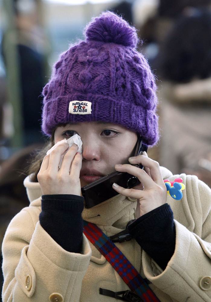 Una viajera japonesa seca sus lágrimas mientras habla por teléfono en el Aeropuerto Internacional Incheon de Corea del Sur el 11 de marzo. Todos los vuelos quedaron cancelados tras el terremoto de magnitud 9.