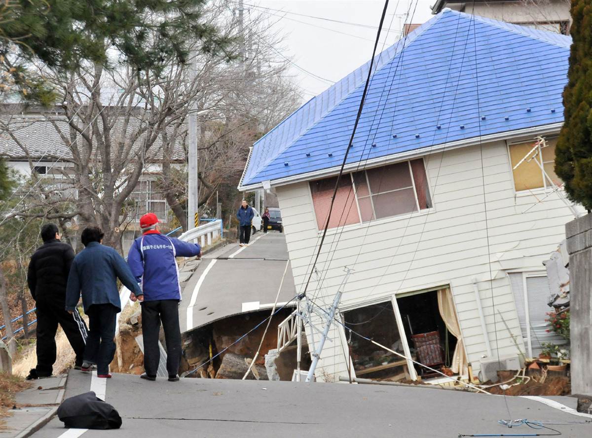 Habitantes de Sukagawa, en la prefectura de Fukushima, observan una casa derruida junto a una sección de una carretera también hundida debido al fuerte terremoto.