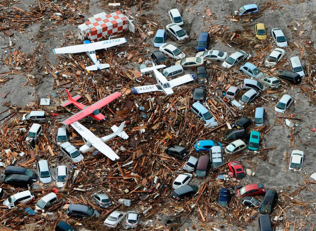 Coches, avionetas y escombros fueron arrastrados por el tsunami, según se ve en esta foto del Aeropuerto de Sendai.
