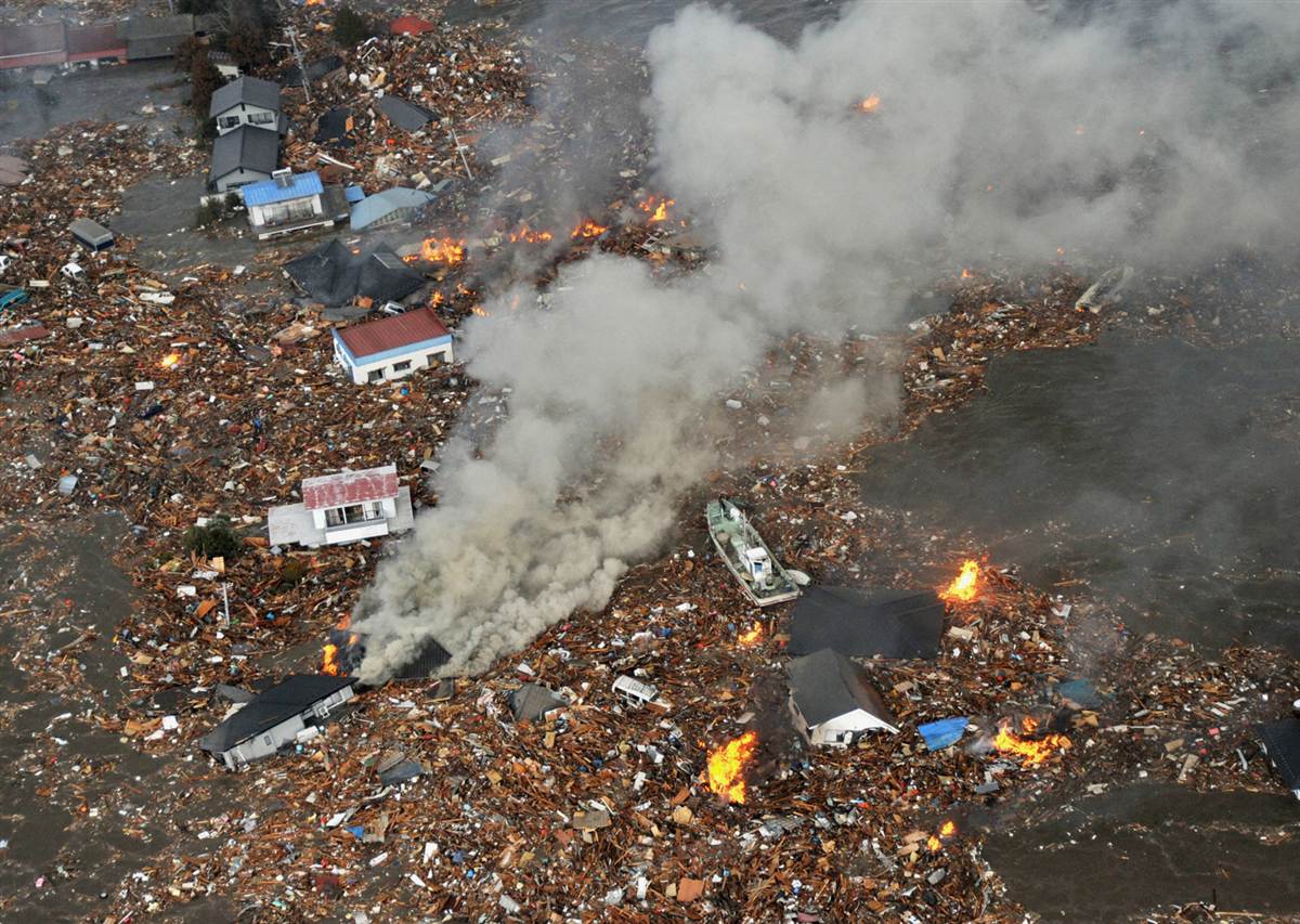 En la foto aparecen varias casas incendiadas en medio de la devastación que produjo el tsunami en la ciudad de Natori, al noreste de Japón.