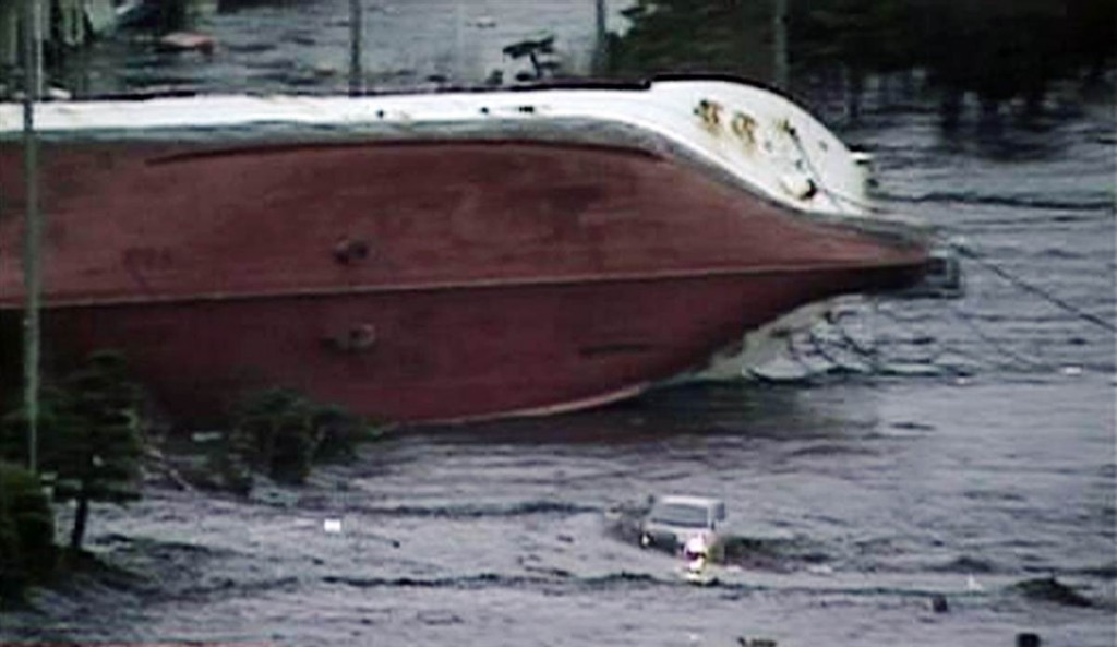 Un barco apareció volcado tras el paso del tsunami en Hachinohe.