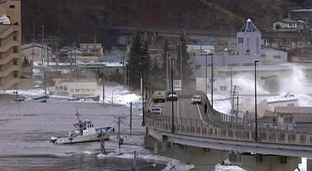 El tsunami arrastró este barco hasta un puente del puerto de Kamaishi, como se puede ver en esta imagen extraída de un vídeo.