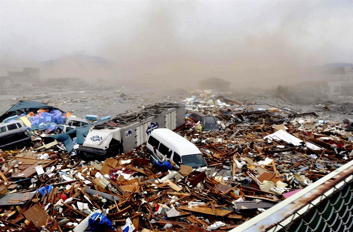 Coches y otros escombros fueron arrastrados por las olas del tsunami en Kesennuma, prefectura de Miyagi.