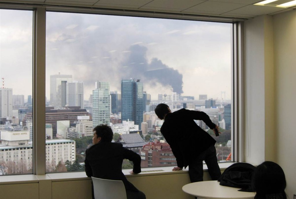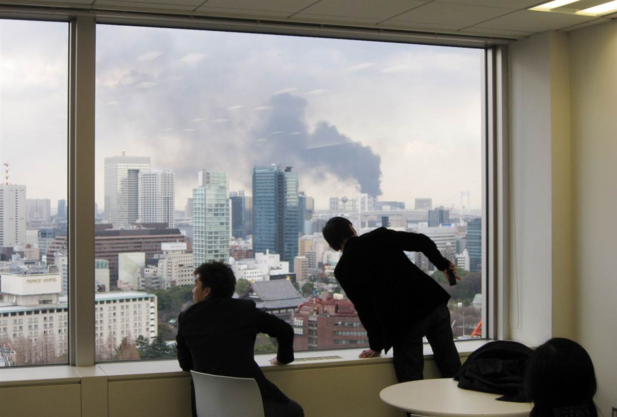 Dos hombres contemplan con miedo el humo que aparece en el horizonte de la ciudad de Tokio tras el fuerte terremoto.
