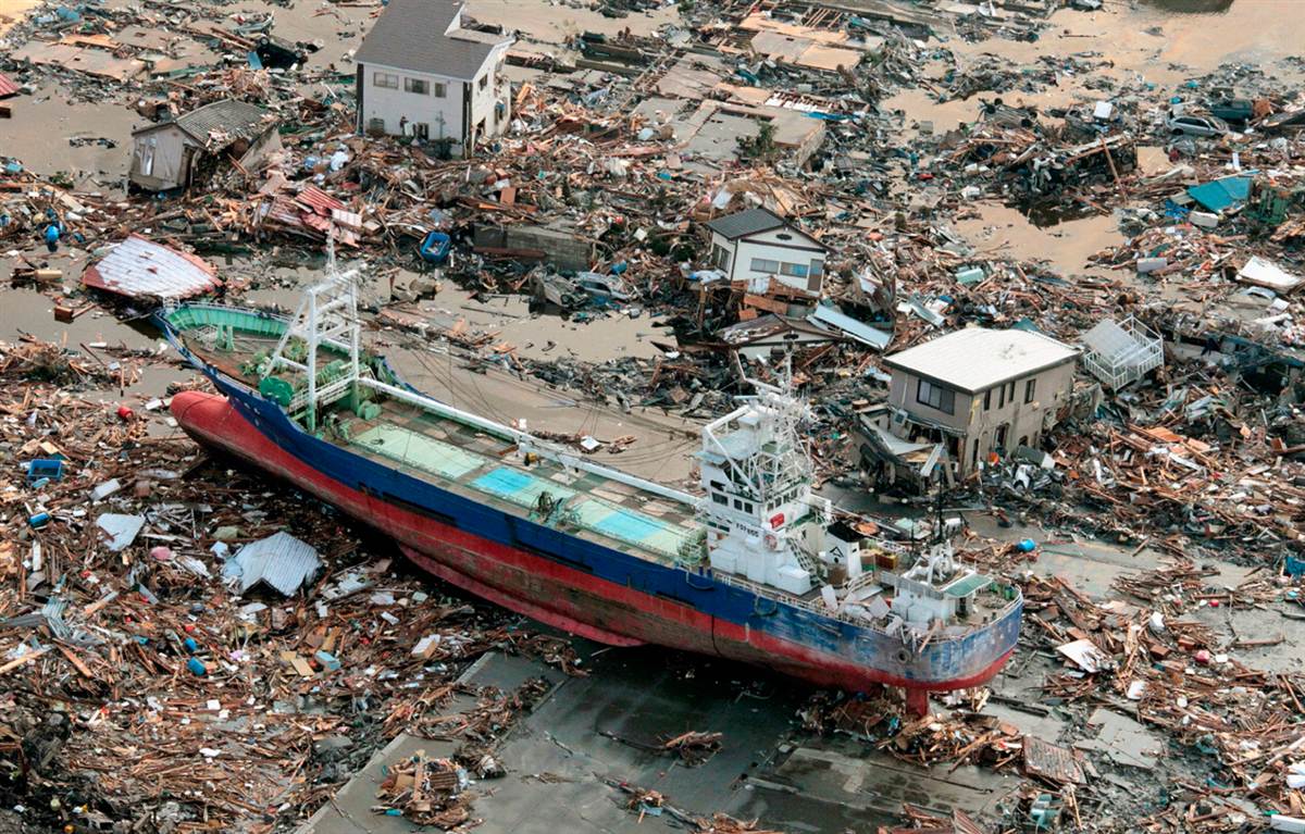 Un barco quedó arrastrado por el tsunami en medio de una ciudad devastada en la prefectura de Miyagi.