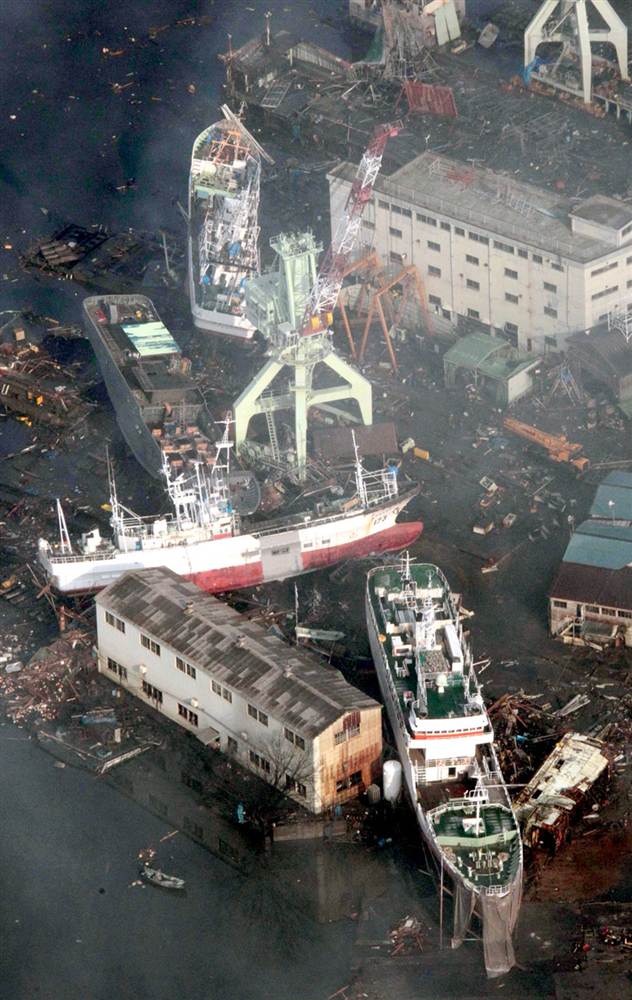 Barcos arrastrados por el tsunami aparecieron en tierra sobre el puerto de Kesennuma, en la prefectura de Miyagi, la mañana del sábado 12 de marzo.