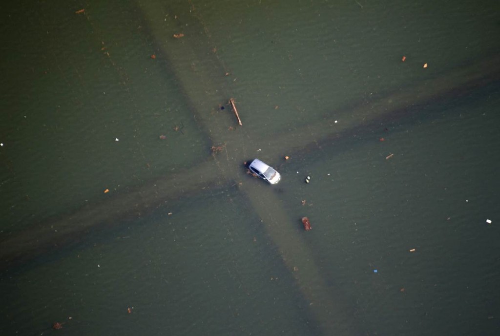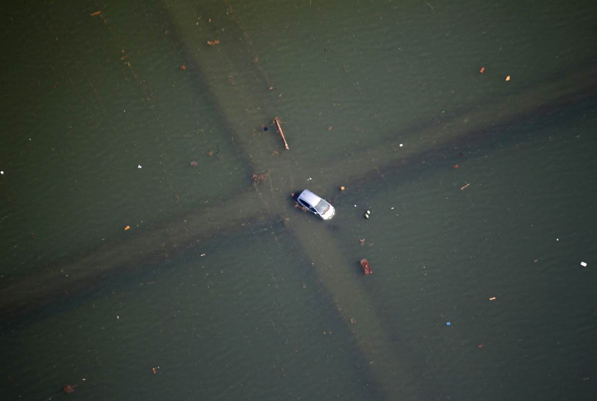 Este vehículo aparece casi sumergido en un cruce de carreteras de Sendai.