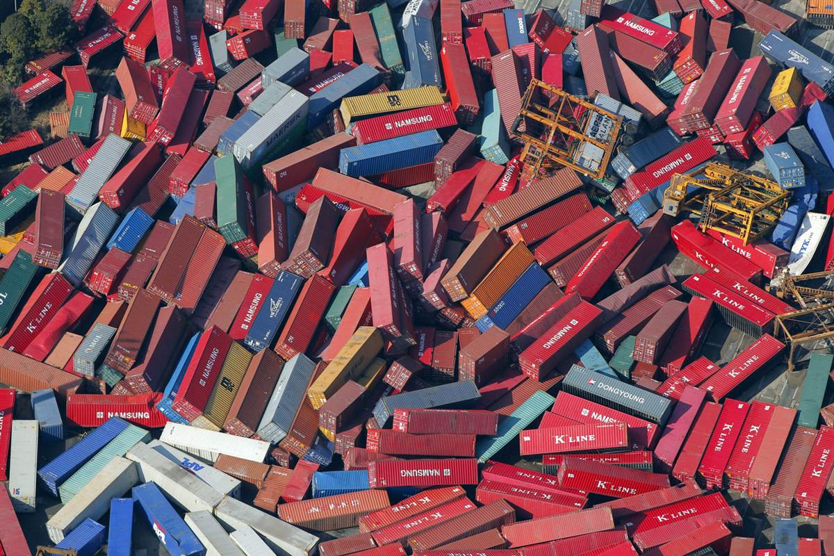 Contenedores de cargamento desplazados en Sendai, al norte de Japón, el sábado 12 de marzo tras las fuertes corrientes del tsunami.
