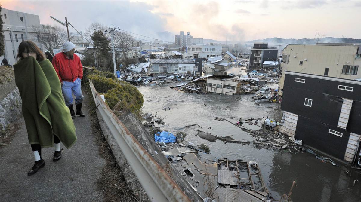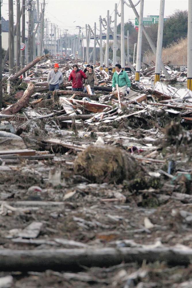Personas abriéndose paso entre los escombros de sus casas derrumbadas, tras el terremoto y tsunami que asolaron Sendai el día anterior.