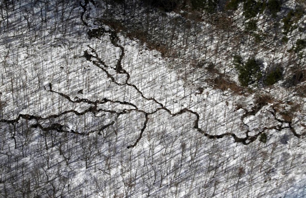 En este terreno nevado cercano a la zona devastada en Sendai, pueden verse las grietas producidas por el terremoto.