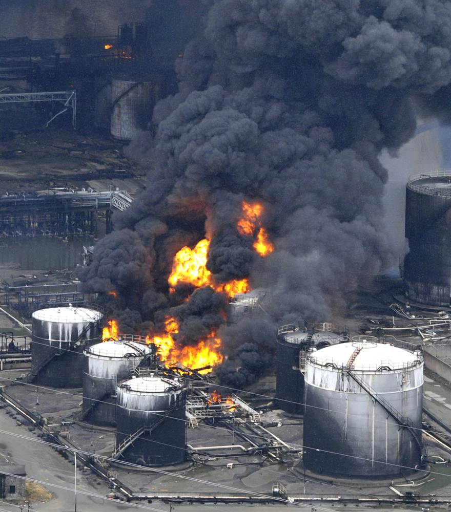 Incendio producido por el terremoto consumiendo un área industrial en Sendai.