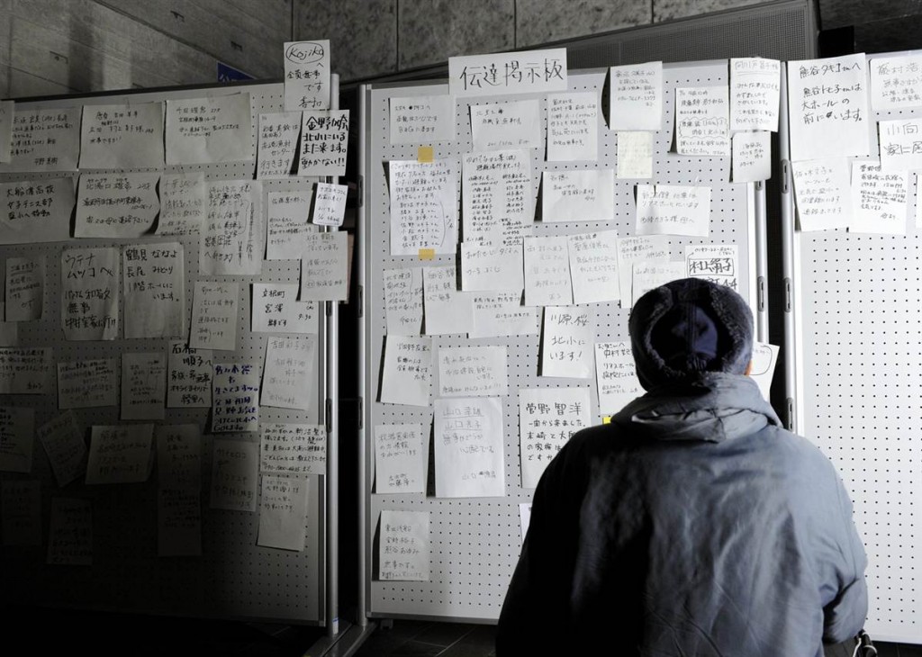 Un residente de Ofunato (prefectura de Iwate) consulta un tablón de anuncios en un centro de evacuaciones el 12 de marzo de 2011.