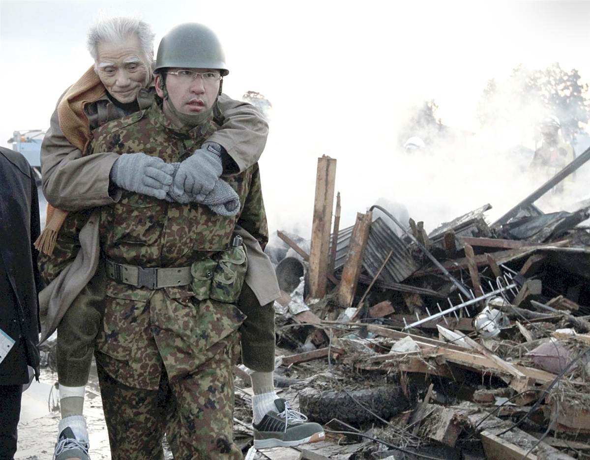 Un miembro de las Fuerzas de Autodefensa lleva a una persona mayor a sus espaldas mientras camina entre los escombros en Natori, el 12 de marzo de 2011.
