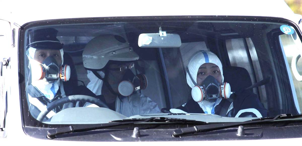 Oficiales de policía patrullan con máscaras de gas en un vehículo por las cercanías de la Unidad 1 de la central nuclear de Fukushima, entre Okumamachi y Minamisoma (prefectura de Fukushima),