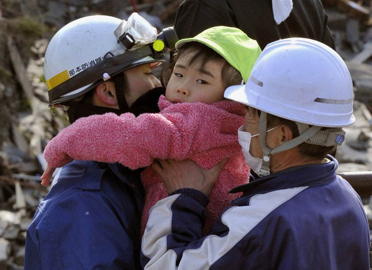 Personal del equipo de rescate sostiene a una niña que fue rescatada de un edificio tras el terremoto y el tsunami en Kesennuma, en la prefectura de Miyagi, el 12 de marzo de 2011.