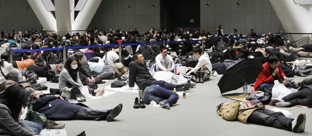 Estas personas se quedaron sin medios para volver a sus cassa tras el terremoto. El edificio del Foro Internacional de Tokio fue empleado como refugio para dar cobijo temporal el sábado 12 de marzo.