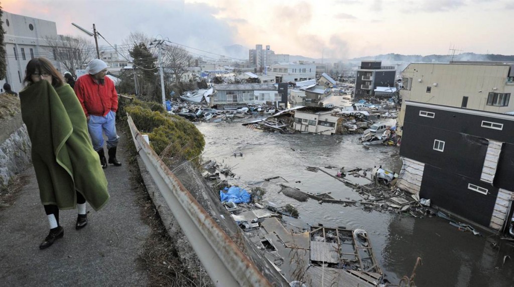 Evacuados andando entre las casas destrozadas por el tsunami y el terremoto en Sendai el 12 de marzo.
