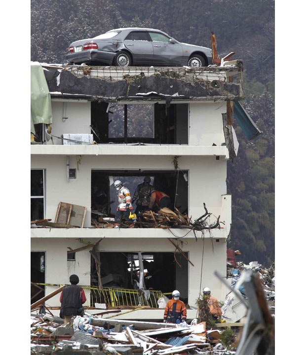 Vehículo encima de la parte superior de un edificio de tres plantas en Minamisanriku, prefectura de Miyagi.