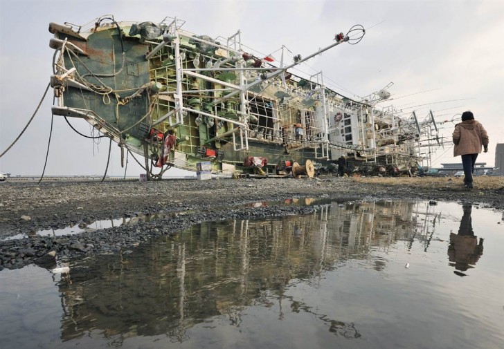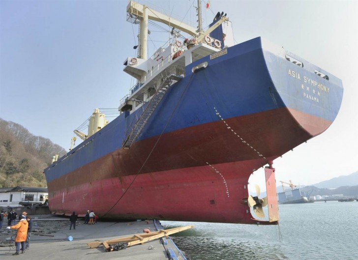 Un carguero apareció montado en el puerto tras el tsunami en Kamaishi, prefectura de Iwate.