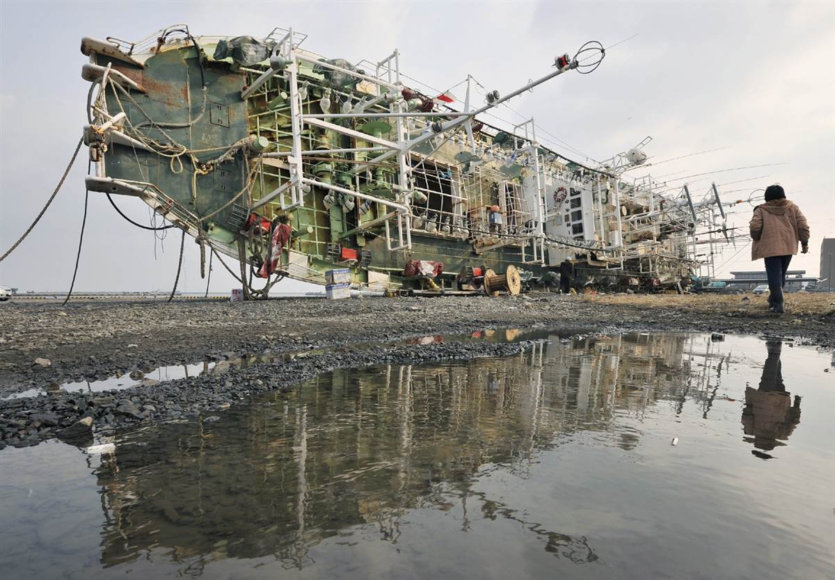 Barco de pesca arrastrado por el tsunami en Hachinohe.