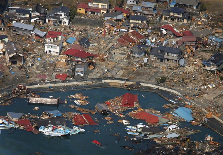 Barcos y casas derribados entre más escombros flotando en el mar de Kesennuma, prefectura de Miyagi.