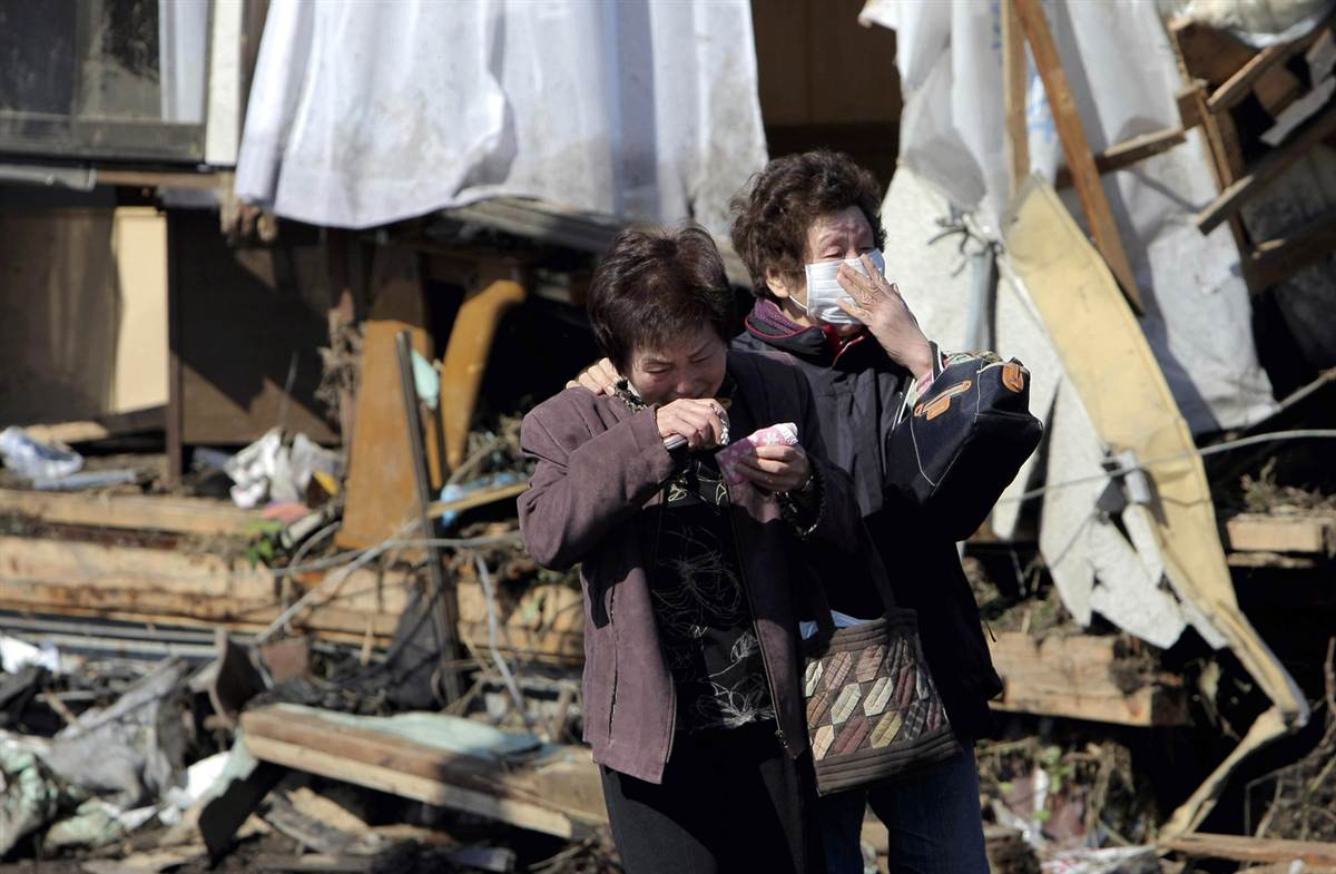 Mujeres contemplando los estragos causados por el tsunami en la ciudad de Minamisoma, prefectura de Fukushima.