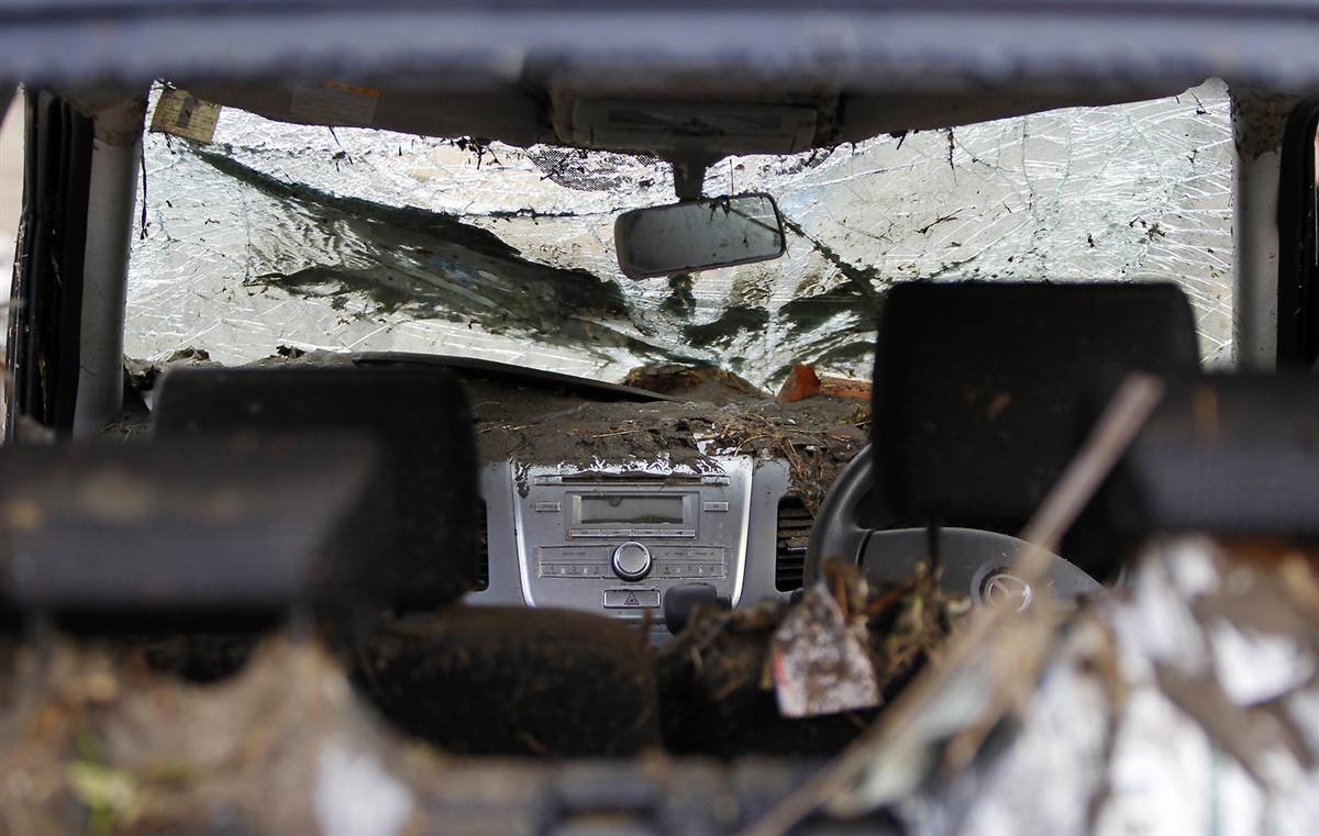 Interior de un coche destrozado por el tsunami y los escombros en Rikuzentakata.