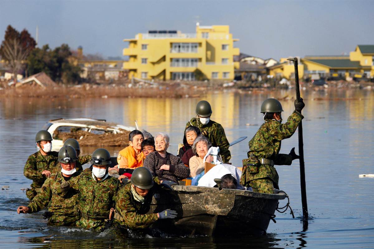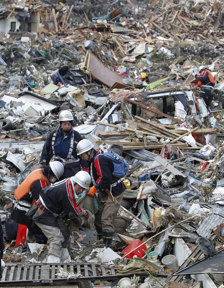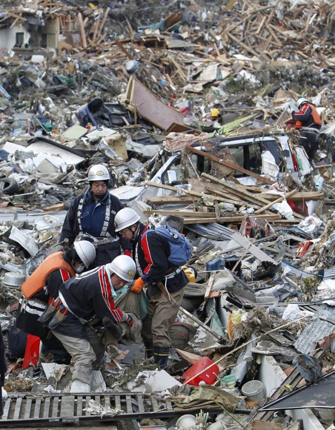 Un equipo de las Fuerzas de Autodefensa de Japón traslada a varios supervivientes a un lugar seguro en la ciudad de Minamisanriku, prefectura de Miyagi. Este tercer día, la Agencia Meteorológica de Japón aumentó la magnitud del seísmo a 9.0, aunque en un principio se catalogó como 8.8.
