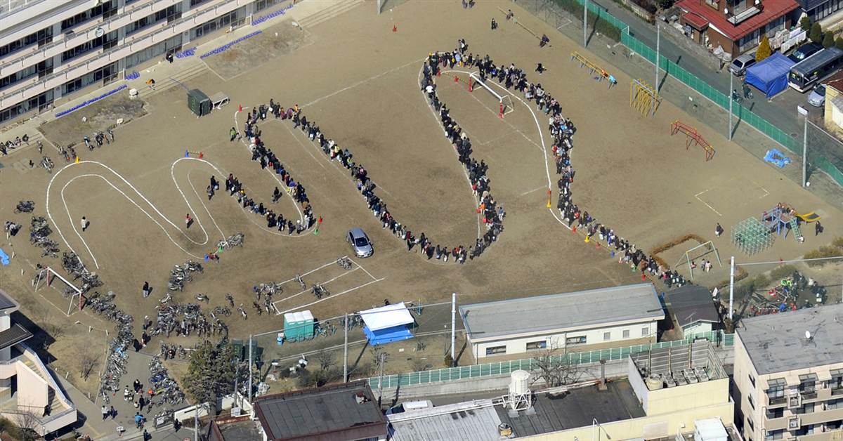 Personas formando una cola para recibir suministro de agua potable en el patio de una escuela de Sendai.