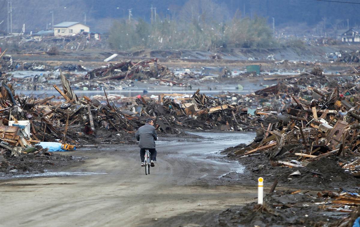 Hombre circulando en bicicleta a través de la devastación que ha dejado el tsunami a su paso por Rikuzentakata.