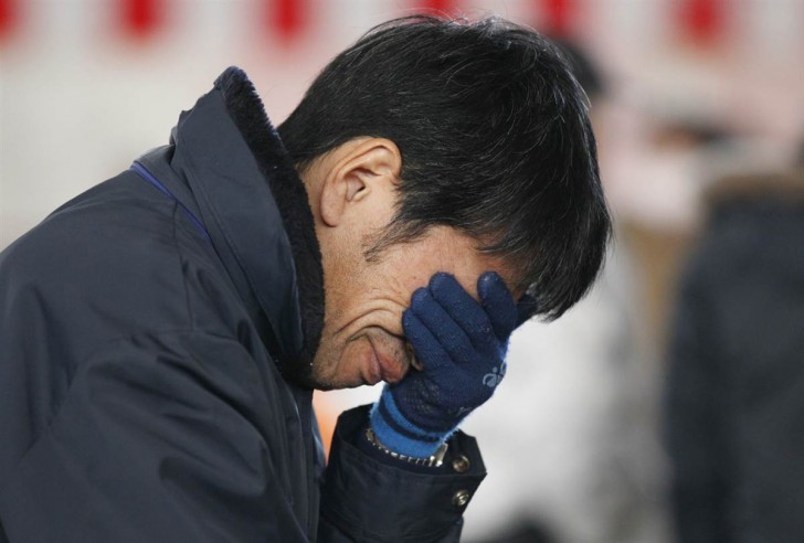 Un hombre llora tras contemplar una tabla con los nombres de otros supervivientes en un refugio de Rikuzentakata, en la prefectura de Iwate.