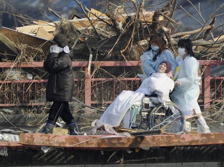 Una paciente es evacuada de un hospital destruido en la ciudad de Otsuchi, prefectura de Iwate.