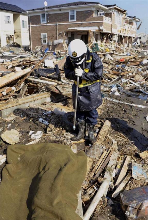 Un policía reza ante una víctima del tsunami encontrada entre los escombros en Sendai.