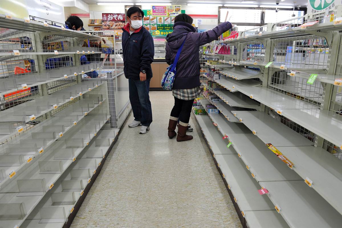 Estanterías vacías en una tienda de Fukushima debido al pánico por el desastre acontecido dos días antes, que provocó un acopio desmesurado entre los habitantes.