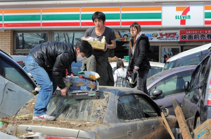 Trasladando víveres a través de la maraña de coches arrastrados a las afueras de una tienda en Tagajo, prefectura de Miyagi.