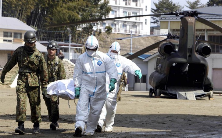 Una persona, que se cree que ha sido contaminada por la radiación, es trasladada en una bolsa blanca al centro de tratamiento radiactivo en Nihonmatsu, prefectura de Fukushima.