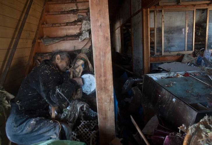 Un residente de la ciudad de Iwaki (prefectura de Fukushima), comienza la limpieza de los escombros arrastrados por el tsunami.