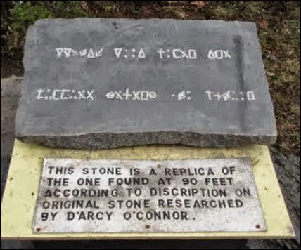 Inscripciones indescifrables: Abajo, una reconstrucción de la lápida de piedra con las misteriosas inscripciones que encontraron los hombres de la Onslow Company a principios de 1800. La piedra fue remitida a Halifax, y varios entendidos intentaron descifrar los símbolos inscritos en la misma. Finalmente un maestro irlandés averiguó este mensaje: «Forty feet below, two million pounds are buried» («A 12 metros por debajo hay enterrados dos millones de libras»).