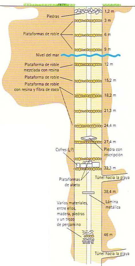 Al día siguiente, Daniel regresó acompañado de dos amigos que conocían las leyendas locales sobre piratas y tesoros escondidos y comenzaron a excavar. Pronto se dieron cuenta de que la hondonada escondía un pozo muy peculiar. A medida que avanzaban, encontraban cada tres metros una plataforma de tablas de madera de roble. Al llegar al tercer nivel tuvieron que abandonar la empresa porque era demasiado complicada para ellos.