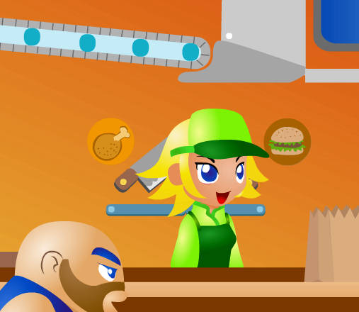 Ayuda a esta chica que ha comenzado a trabajar en una hamburguesería de famoso renombre y tiene que servir y cocinar los pedidos para los clientes. Existen varios tipos de máquinas: nuggets, hamburguesas, patatas fritas y zumos o jugos. Las dos primera máquinas sólo necesitan que aprietes el botón de funcionamiento una vez, pero la de patatas y jugos necesitan que las operes manualmente, realizando movimiento circulares o de arriba a abajo para mover las manivelas hasta conseguir los productos. Luego coloca los productos en la bolsa de compra y asegúrate que te has acordado de todo lo que te pidió el cliente.