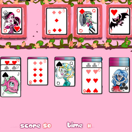 El clásico juego de cartas, «el solitario», esta vez llega ambientado en el universo Monster High para tu diversión. El funcionamiento es el siguiente. Debemos ir colocando en los cuatro puestos las cartas por orden As, 2, 3, 4, 5, 6, 7, 8, 9, 10, J, Q y K según cada palo, que puede ser corazones, picas, tréboles o diamantes. Podemos ir cogiendo del montón de arriba e irlas poniendo en las filas inferiores siempre alternemos colores (negro-rojo) y que sean de diferente palo. Hay que darse prisa, pues el tiempo apremia.