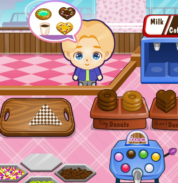 En este juego podremos cocinar donuts de diferentes formas (con agujeros, en forma de corazón o redondos sin agujero), así que como preparar leche o café para los clientes que vengan a nuestra cafetería. Fíjate en los pedidos que te encargue la gente y ve realizando los pasteles como te digan. Hay una máquina de glaseado y otra de mermelada. Coloca el donut abajo, escoge el sabor y dale a la palanca para aplicar el sabor al donut. Si tienes que echarle algo más, deja el donut en la mesa de trabajo de los adornos y colócale fideos de chocolate de colores, almendras o frutas por encima. Para preparar la bebida, coge un vaso vacío y déjalo en la máquina según necesites leche (MILK) o café (COFFEE). Cuando tengas cada elemento, déjalo en la bandeja, y cuando hayas preparado todo, dale al botón SERVE para que el cliente apruebe si el pedido está bien hecho. ¡A servir pasteles se ha dicho!