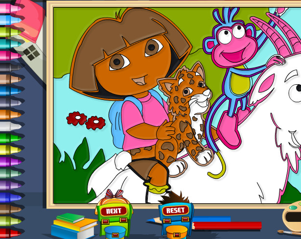 En este divertido juego podremos colorear y pintar a nuestra amiga Dora la exploradora. En la paleta de instrumentos dispones de muchos colores para pintar el dibujo. Utiliza el ratón y ve pinchando en cada zona para darle color. Finalmente, dale a NEXT, pon tu nombre y verás el resultado final.