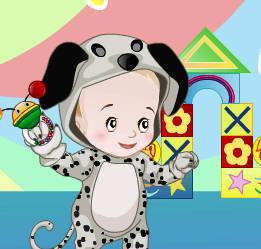 En este juego podremos vestir a un bebé con disfraces y trajes diferentes. Tenemos los petos o vestidos enteros, zapatos, guantes, gorros o partes de la cabeza, así como chupetes para cambiar. También podremos elegir una expresión para la cara del bebé, existiendo sorpresa, lloro, alegría, indiferencia, pucheros o dormido entre otras, así como algún articulo para que lo coja, como juguetes y peluches. Escoge los disfraces y haz que tu bebé esté contento.