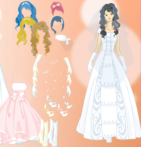 En este juego podrás escoger trajes, vestidos, peinados y complementos para la princesa que se casará. Escoge entre los vestidos colores suaves, velos de novia, sombreros, guantes, zapatos de tacón más bonitos para la princesita novia y para termianar, la puedes peinar escogiendo una peluca como peinado.
