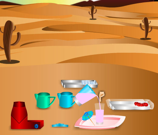 En este juego podrás preparar un batido de fresa para un hombre que está en el desierto muriéndose de sed. Para elaborarlo, tienes fresas, yogur líquido y leche, aparte de un refrigerador y cubitos de hielo. Mezcla bien los ingredientes y mételo un rato en la nevera para enfriarlo. Ya verás que contento se pone el beduino cuando vea su refrescante batido preparado.