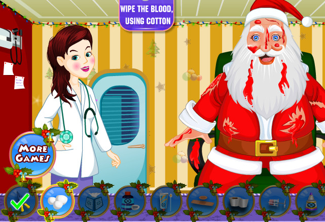El pobre Santa Claus a sufrido un accidente con el trineo y esta un poquito malito, en el golpe se le han clavado varios caramelos y le han hecho sangran, así que necesita un poco de ayuda para curarse. En este juego de de hospital, trabajaremos como enfermera para poder curar a Santa. Solo tenemos que seguir las instrucciones que nos marcan para poder curarlo. Seguro que lo hacemos muy bien y Santa estará muy contento con nosotras.